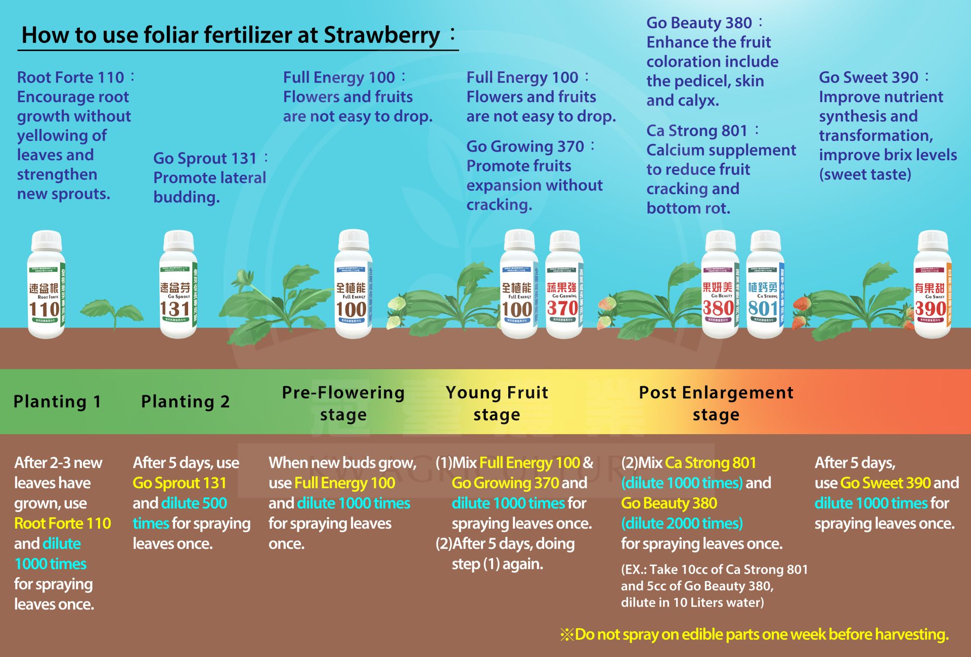 產品效果: 1. 改善營養的合成和轉化。 2. 增加甜度,提升風味。 3. 改善果實的品質和顏色。 4. 增加光合作用速率。 5. 促進營養物質重新分配到果實並促進吸收。 適用作物: 任何類型的果樹(膨大期後)。 使用方法: 1. 任何類型的果樹或結果開花作物(膨大期後)。 2. 膨大期後:稀釋1000倍用於噴灑葉片;或稀釋500倍用於根部澆水;每15~30天使用一次,直到收穫。使用量可根據天氣、土壤濕度和植物生長狀況進行調整。 3. 可交替使用噴灑或澆水的方式與"果妍美"交替使用,以增強顏色和風味。 **請勿在陽光下和高溫環境中使用本產品;避免蒸發效應影響植物生長。 **噴灑葉片時,請務必按照指定的稀釋比例稀釋溶液,以防止葉片灼傷。
