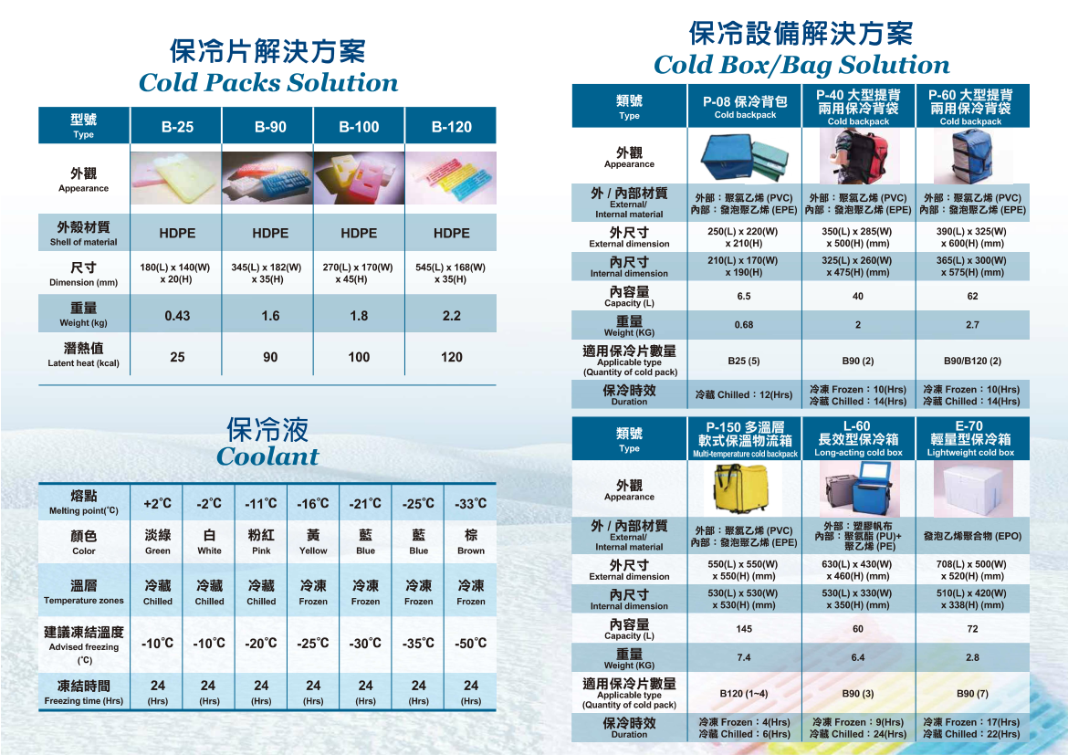 工業技術研究院多年來即開發出從-2℃至-25℃等不同蓄冷能力的蓄冷片,以內部液體顏色來區分適用溫層,方便使用者管理,更可客製不同的尺寸,以搭配不同的應用情境。冷鏈應用之相關醫藥生鮮農產品之物流、零售、儲存市場。