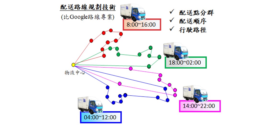 物流業者配送貨品多以人工安排運輸車輛,由送貨司機自行決定送貨順序。透過ai演算法指派配送車輛、規劃最適路順,以系統運算結果取代人工排車,減少依賴人工經驗及車次安排時間,加速出貨作業並讓貨品能準時準確地送達客戶。