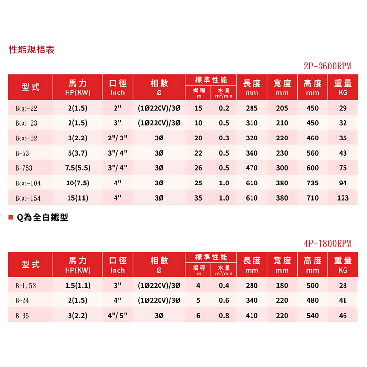 5.本系列泵浦皆採用全新馬達矽鋼片、軸心、轉子經高速精密加工,使馬達運轉穩定。※2hp以下(含)均可選配加裝浮球開關。
