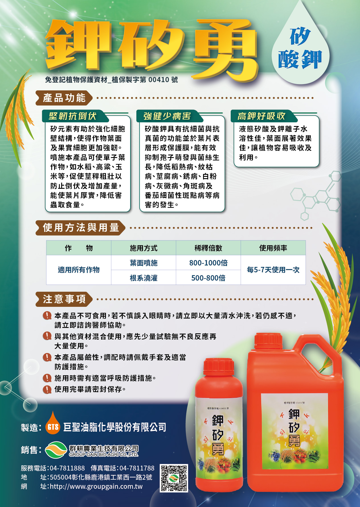 ◆液態矽酸與鉀離子水溶性佳,葉面展著效果好,讓植物容易吸收及利用。