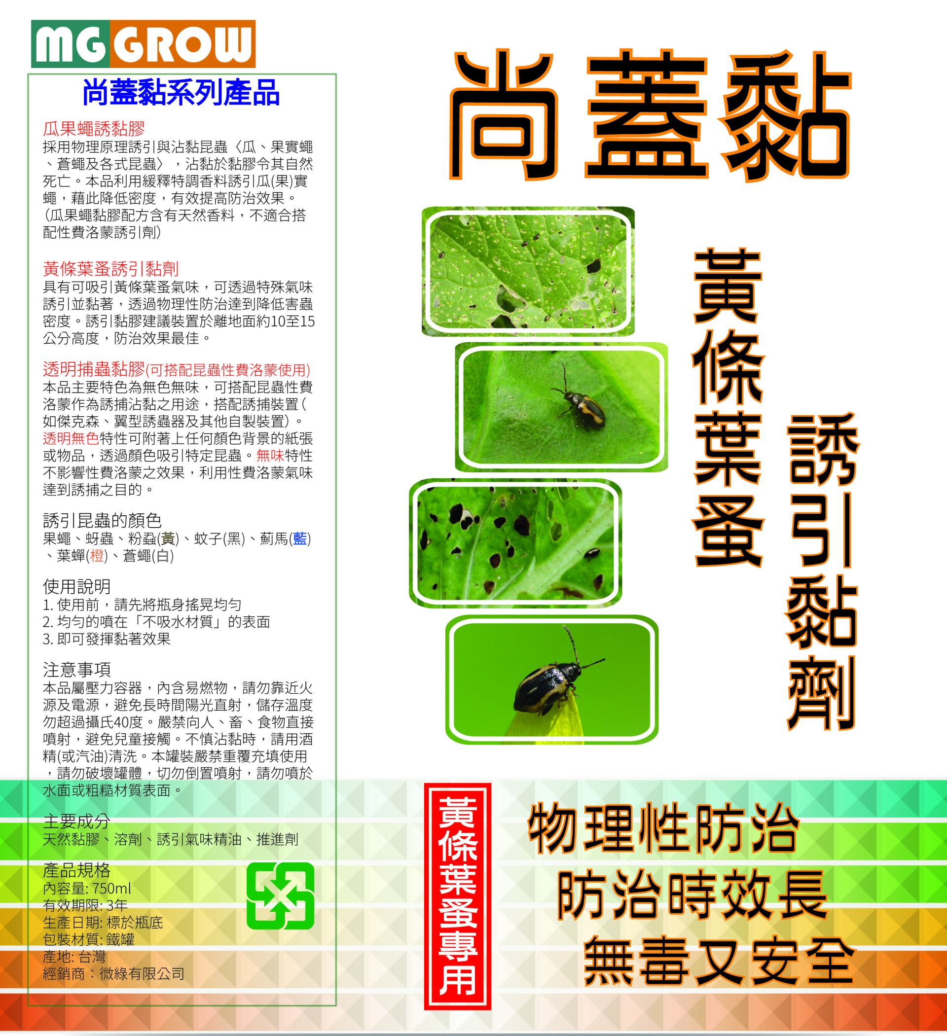 瓜果蠅誘黏膠採用物理原理誘引與沾黏昆蟲〈瓜、果實蠅、蒼蠅及各式昆蟲〉,沾黏於黏膠令其自然死亡。本品利用緩釋特調香料誘引瓜(果)實蠅,藉此降低密度,有效提高防治效果。(瓜果蠅黏膠配方含有天然香料,不適合搭配性費洛蒙誘引劑)
