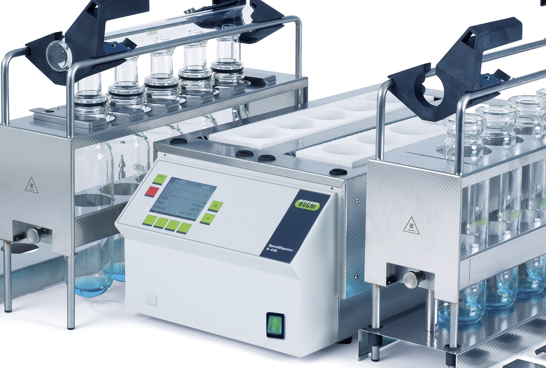 the speeddigester k-425, k-436, and k-439 are advanced infrared digestion devices from buchi designed to enhance laboratory digestion efficiency. these digesters can reach a maximum temperature of 580°c and accommodate between 5 to 12 sample positions, making them suitable for various digestion applications, including kjeldahl nitrogen determination, micro-kjeldahl, chemical oxygen demand (cod), hydroxyproline, and aqua regia digestion.